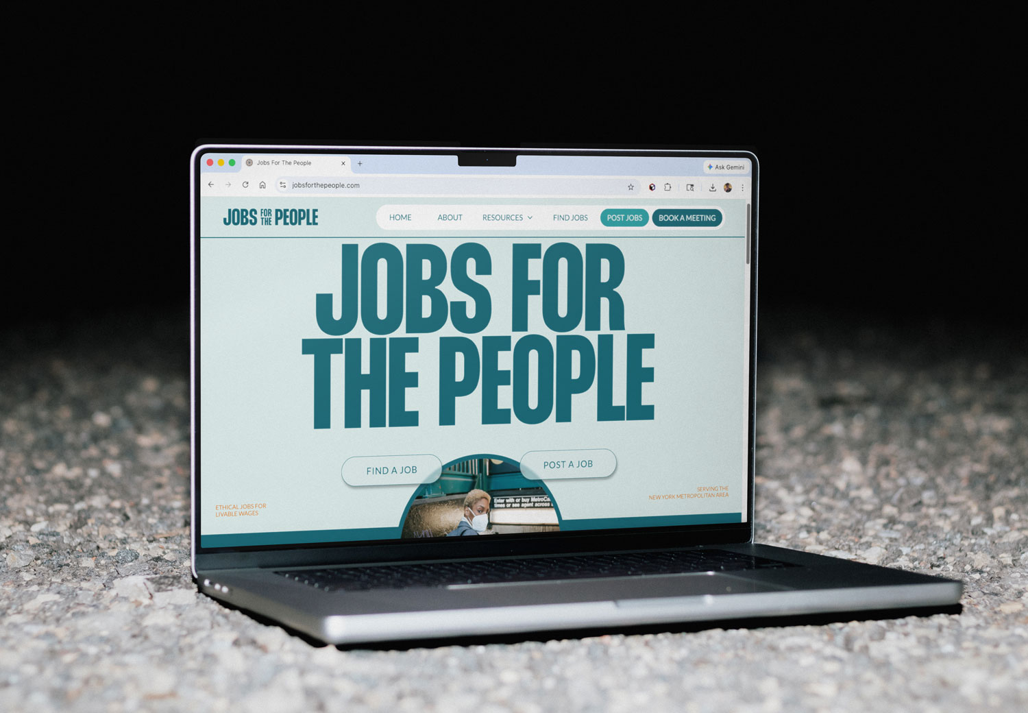 The Jobs for the People brand arrived with conviction. We anchored the visual identity in a bold, commanding typeface evocative of early 20th-century protest posters — the kind of typography that has history, weight, and something to say. Paired with contemporary photography of urban scenes and diverse populations, the brand feels both rooted and current. The hero image — a masked woman entering the subway — hit immediately. Sunny recognized it at once as the perfect embodiment of her audience: purposeful, community-minded, and moving forward. A scroll of urban photography in the footer reinforces that activist, communal energy throughout the browsing experience.